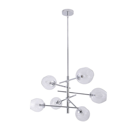 Elevate your space with the Avista Lighting Hillcrest Chandelier 6-Light Chrome, a masterpiece that seamlessly blends form and function. Crafted with precision, this chandelier boasts clear glass shades adorned with unique dimples, creating a mesmerizing interplay of light and texture. The arms of the chandelier are adjustable, allowing you to customize the arrangement to your liking, whether you prefer an elegant upward curve or a more modern downward slope. The Chrome metal finish exudes sophistication, making it a statement piece in any room.