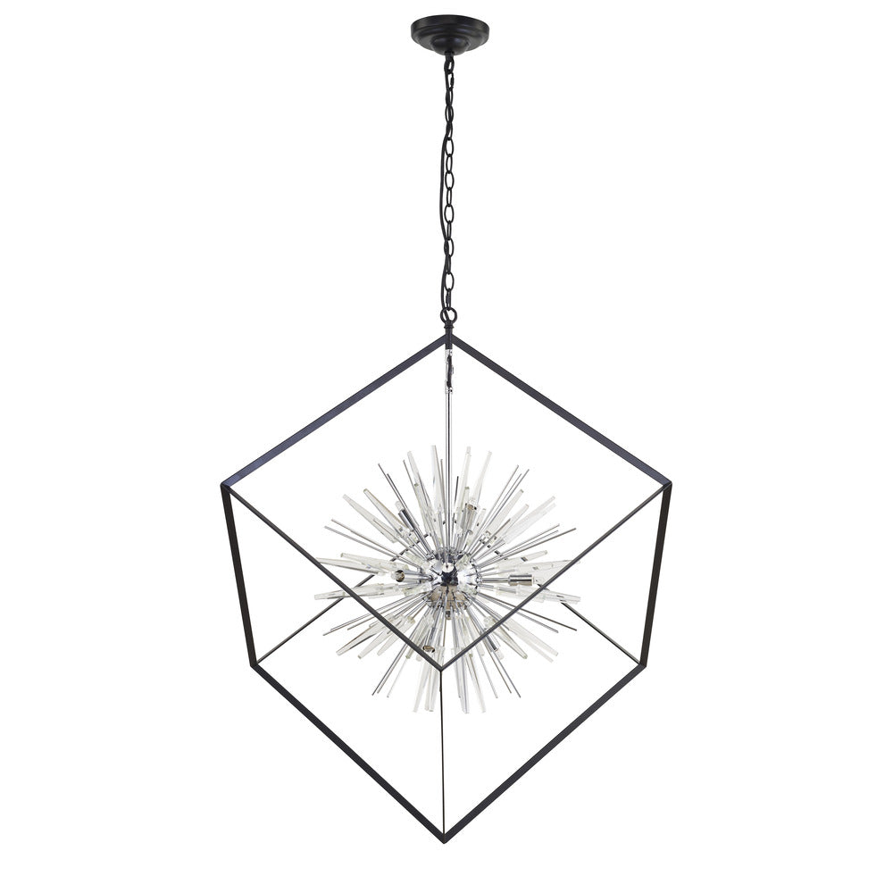 Elevate your decor with the Avista Lighting 9-Light Starburst Chandelier 37", a stunning masterpiece that seamlessly blends modern design with opulent flair. This captivating chandelier boasts a black metal square frame adorned with sparkling crystal spheres and chrome metal rods at its core, creating a mesmerizing visual symphony. With nine brilliant lights and dimmable functionality, it bathes your space in a warm and inviting glow, making it the perfect centerpiece for dining rooms, foyers, or living areas.