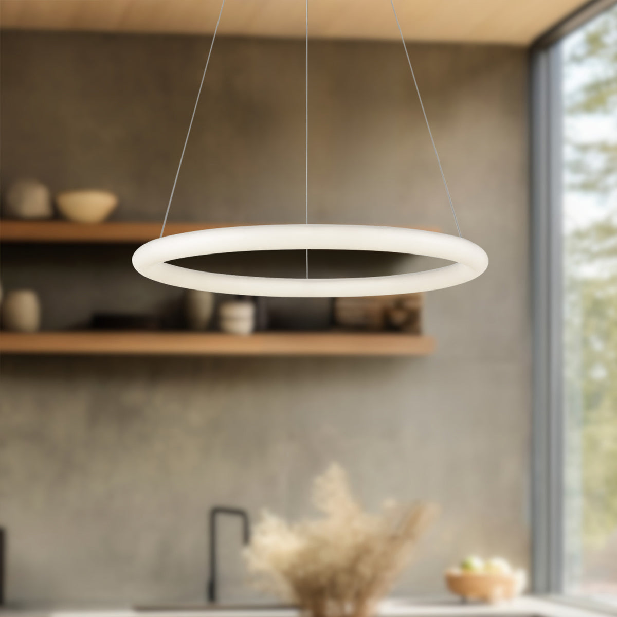 An illuminated circumference of bright uniform light the Cumulus Minor is devoid of extraneous detail appearing as a single endless loop. The miniscule ovoid profile of the polymeric ring condenses the lamp assembly into a compact yet airy visual footprint, a reduced scale from the substantial Cumulus pendant series. Available in multiple sizes.